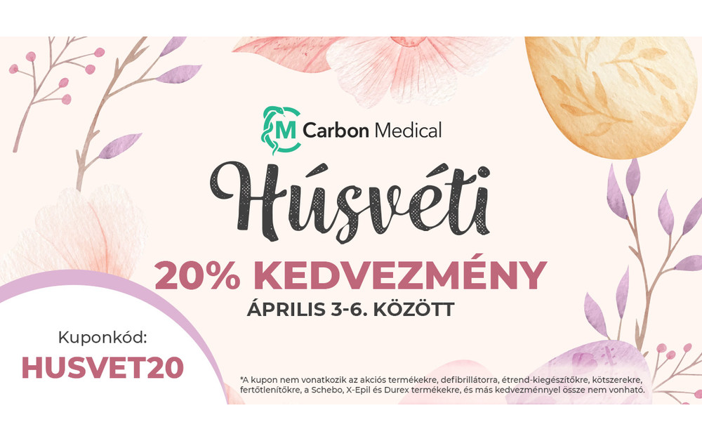 A HUSVET20 kuponkód érvényes a www.carbonmedical.hu weboldalon 2026.04.03-tól (péntek) 2026.04.06. (hétfő) 23:59-ig vagy a készlet erejéig. A kuponkód nem vonatkozik az akciós termékekre, a defibrillátorra, étrend-kiegészítőkre, kötszerekre, fertőtlenítőkre, a Schebo, X-Epil és Durex termékekre, és más kedvezménnyel össze nem vonható.